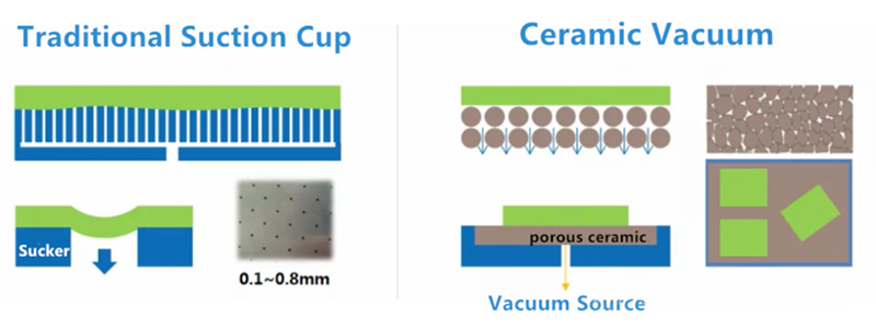 Chuck logam tradisional mempunyai daya sedutan yang tidak sekata, terdedah kepada ubah bentuk bahan nipis, kekurangan sifat anti-statik, dan terdedah kepada haus dan lusuh kerana kekerasannya yang rendah. Sebaliknya, vakum seramik, sesuai untuk bahagian-bahagian nipis, menawarkan sifat anti-statik, dan tahan haus dan tahan karat.