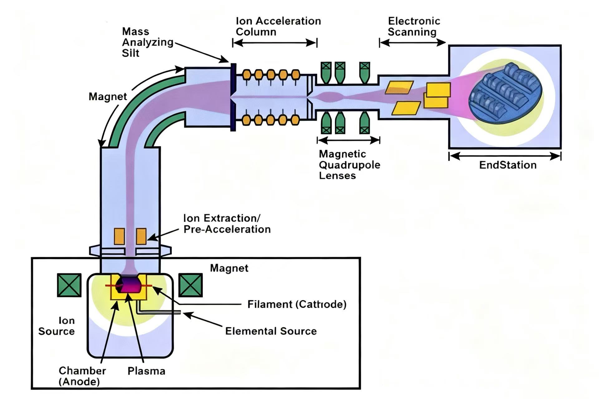 2. Implantasi adalah teknik doping utama dalam pembuatan semikonduktor, yang mempunyai beberapa kelebihan, seperti ketepatan doping yang tinggi, suhu proses yang rendah, dan sedikit kerosakan pada bahan substrat. Khususnya, proses implantasi ion melibatkan pengionan atom-atom pencemaran untuk mencipta ion yang dikenakan, kemudian mempercepatkan ion-ion ini melalui medan elektrik intensiti tinggi untuk membentuk rasuk ion tenaga tinggi. Permukaan semikonduktor kemudian diserang oleh ion-ion yang bergerak pantas ini, yang membolehkan implantasi yang tepat dengan kedalaman doping laras. Teknik ini amat berguna untuk mewujudkan struktur persimpangan cetek, seperti kawasan sumber dan longkang MOSFET, dan membolehkan kawalan ketepatan tinggi ke atas pengedaran dan kepekatan kekotoran.