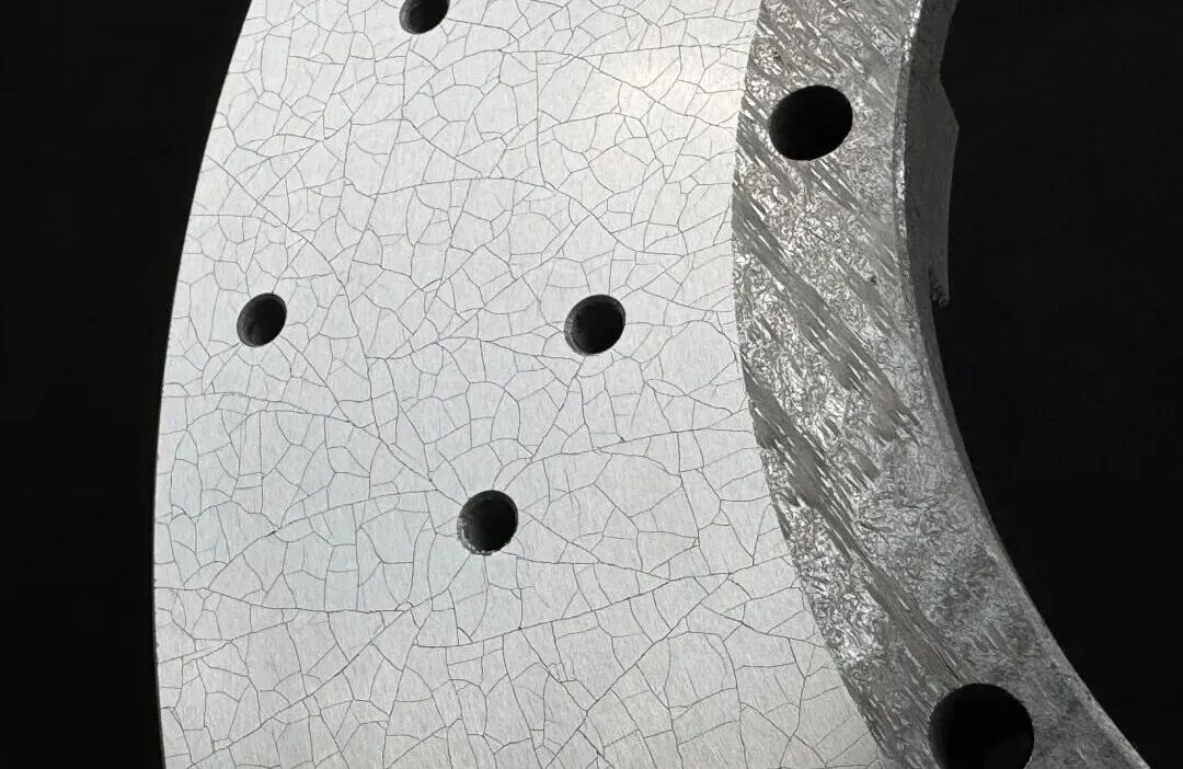 1) Cakera brek karbon-seramik CCBditutup dengan salutan SiC pada permukaannya, memperlihatkan permukaan berkilat dan retakan halus.
