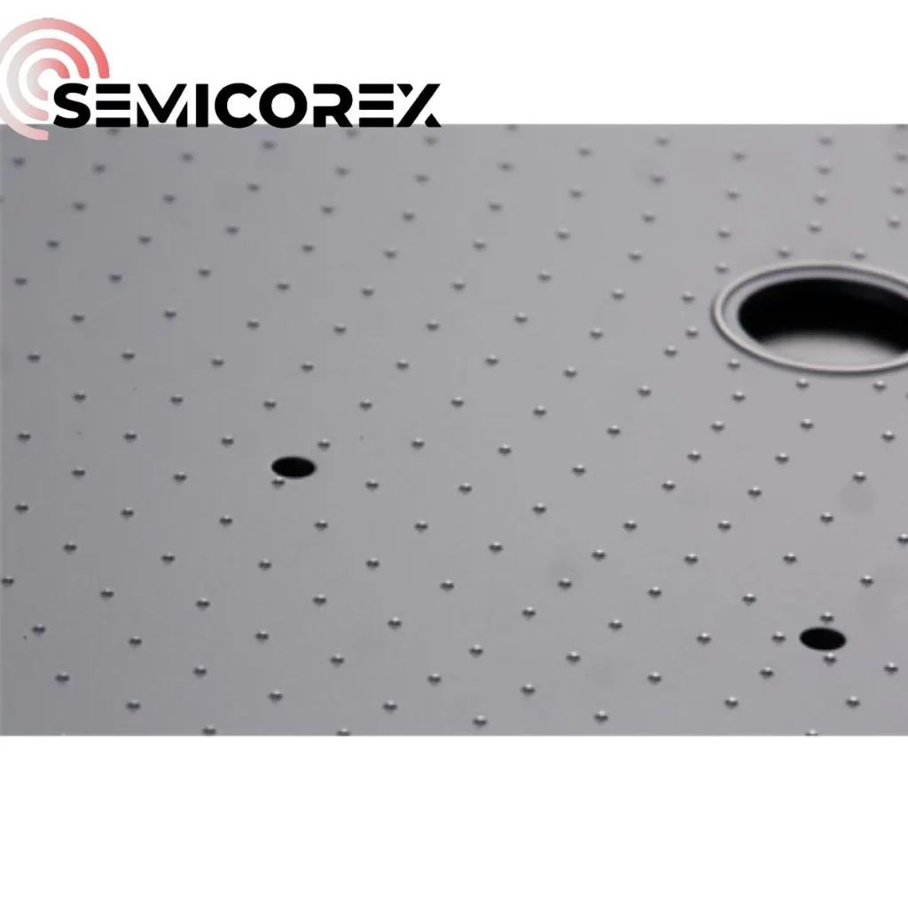 Permukaan Semicorexsilikon karbidachuck pin disusun dengan banyak bonggol bersaiz mikron. Kawasan sentuhan diminimumkan kerana sentuhan dengan bahagian belakang wafer hanya berlaku pada bonggol, yang berkesan mengelakkan calar wafer, pencemaran zarah dan tanda yang tidak diperlukan.